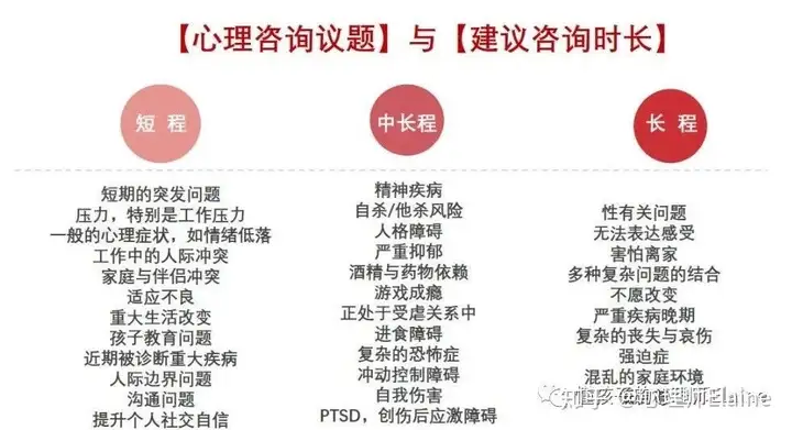 一般而言,短程咨询(周期为6-12次),针对有着明确咨询目标,社会功能没有受到明显影响的人群为主,一般会使用焦点短程、认知行为等咨询技术。