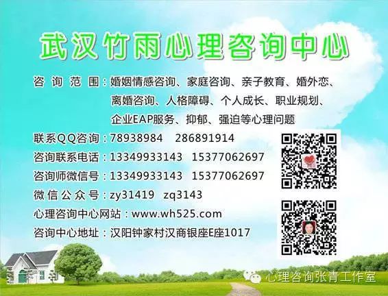 武汉竹雨心理咨询中心张青:高级婚姻家庭咨询师,高级心理咨询师,NGH国际催眠治疗师。国际EAP咨询师,职业规划师,家庭私人心理顾问,也就是家庭的心理保健医生。其职责不仅是针对每个家庭成员个人情绪调节,更重要的是帮助整个家庭建立良好的互动,让家真正成为每个家庭成员 温暖的港湾。